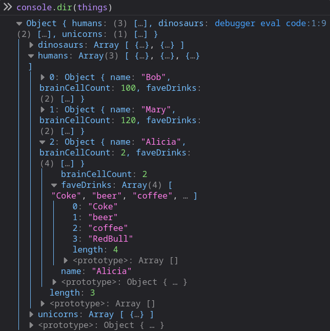 We can optionally give a section a title, by passing a string as the parameter. Sections can be collapsed and expanded in the console, but we can also have a section collapsed by default, by using groupCollapsed