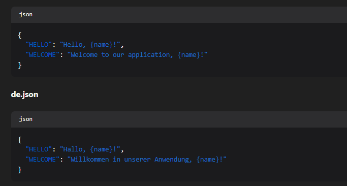 - Maintainability: Keeping translations in external files makes it easier to manage and update them without touching the application code.